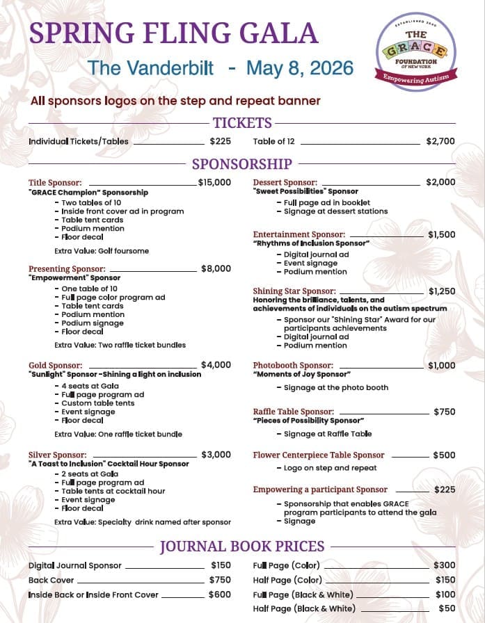 Join The GRACE Foundation on Friday, May 8th at 7PM at The Vanderbilt as we celebrate 26 years of Empowering Autism. Our Gala will feature gourmet food, raffles, live entertainment and more! Congratulations to this year’s honorees! Scroll down to visit our online box office where you can purchase event tickets, raffles, sponsorship and more!